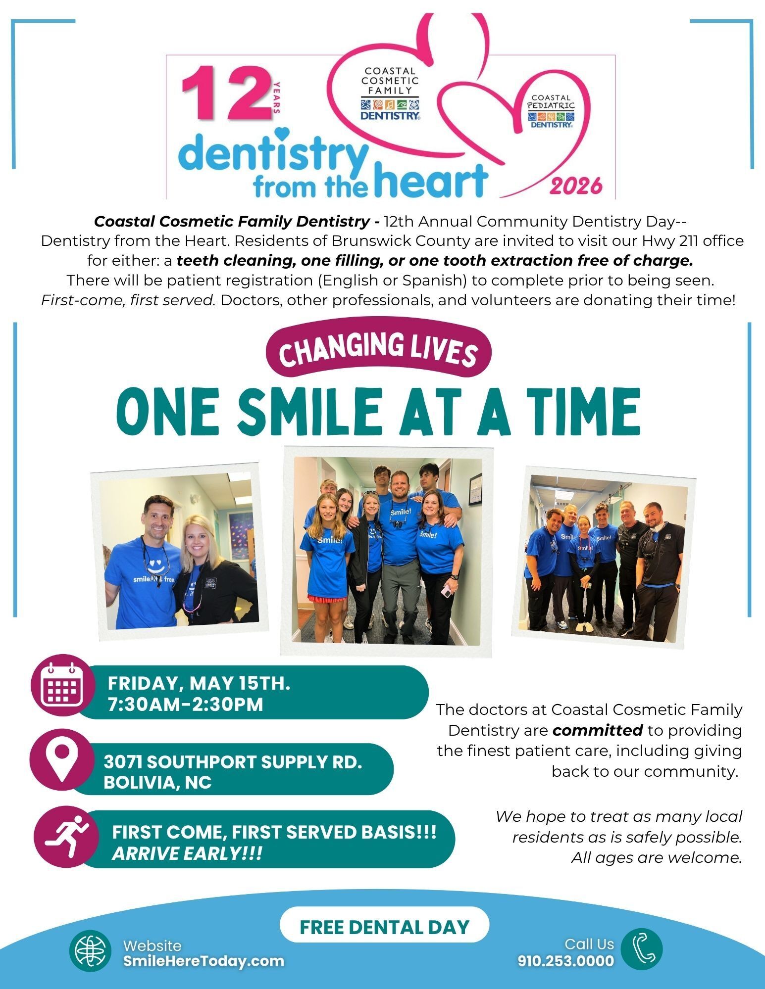 We love what we do, and we love our community. At Dentistry From the Heart, get to serve both! We’re proud to host our 12th Annual Dentistry from the Heart event on May 15th. On this day, we warmly invite residents of Brunswick County to our Hwy 211 office for free dental care: a teeth cleaning, one filling, or one tooth extraction. All ages are welcome.